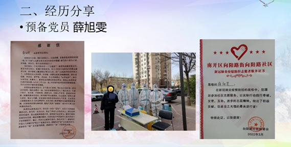 会议伊始,主持人姚天琪同志介绍了大会要求及形式。支部成员共同观看了5月22日蔡奇书记到海淀区检查疫情防控工作的视频,深化北京疫情防控要求。观看完视频之后,由薛旭雯、廖应花、苏若芯三位同学分享了她们在自己家乡参加抗疫工作的经历,涉及防疫宣传、协助核酸检测等多项内容,三位同志积极响应号召,逆向前行,争当志愿服务的排头兵,深入社区和村庄贡献力量,在各项疫情防控工作中发挥了先锋模范作用。随后,党员牛全春、入党积极分子李龙雪、金琳同志就疫情防控问题进行了交流发言,纷纷表示,作为新时代大学生,要严格遵守学校和社区发布的防疫政策,积极响应、减少流动,居家学习也要提高时间利用效率,完成学业目标。