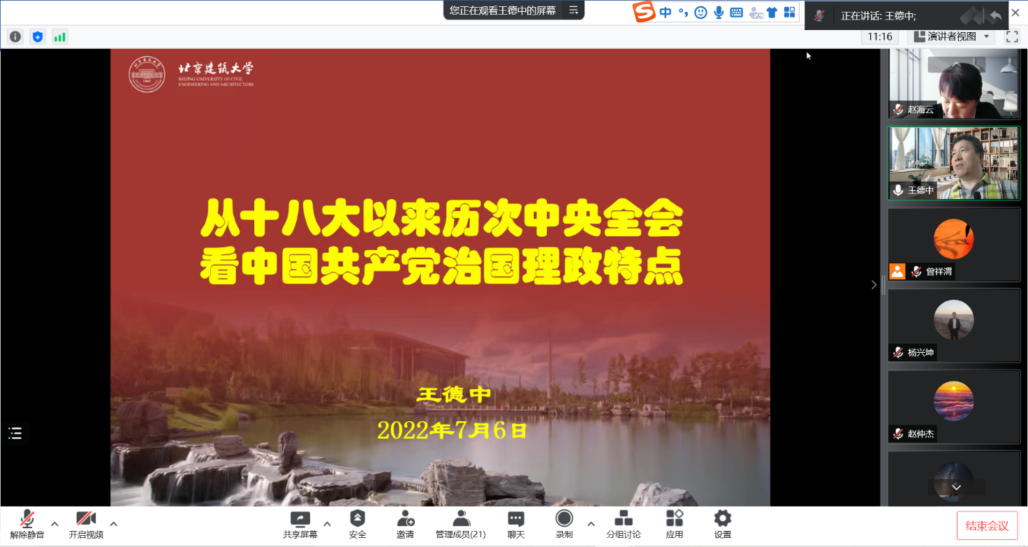 王德中老师详细梳理十八大以来历次全会的核心要义,从八个方面总结了党治国理政的特点,并结合北京市第十三次党代会精神进行阐释和解读,引导与会人员不断提高政治站位,砥砺前行,将学习会议精神的动力源泉转化为推动学院高质量发展的实际行动。