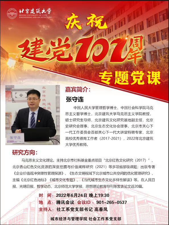 社工系党支部注重校内联合,邀请了马克思主义学院张守连教授,讲授建党101周年专题党课,并带领社工系全体研究和本科生党员共同参加党课学习,打造“师生共同学习链条”,引导全系教师将伟大建党精神转化为推动学院和社工系中心工作高质量发展的具体行动。