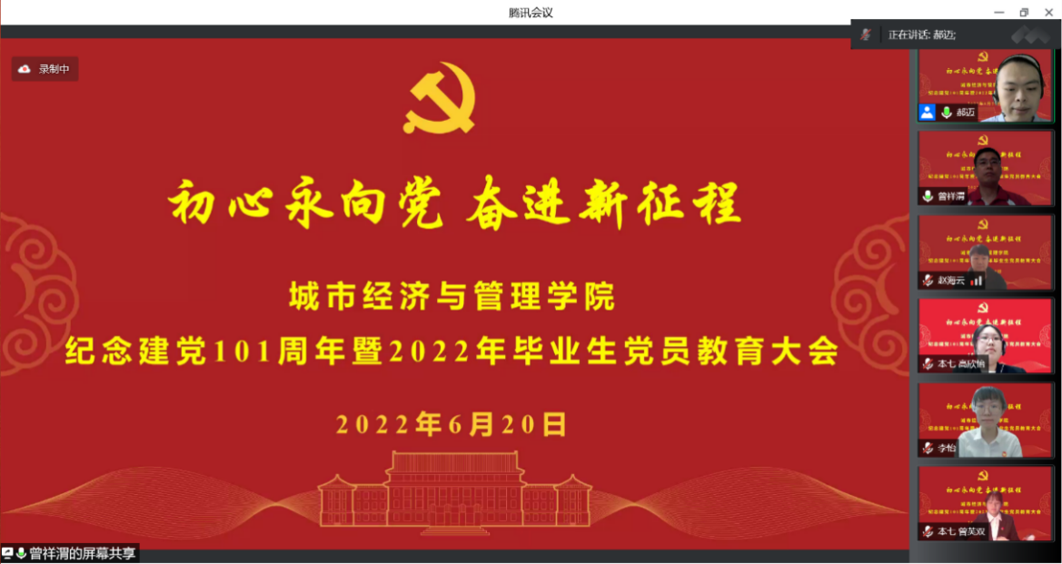 结合毕业生党员离校教育契机,学院党委组织了“初心永向党,奋进新征程”庆祝建党101周年暨毕业生党员教育大会,精心策划了“一堂老党员微党课,一张党员政治生日卡,一封毕业生党员慰问信,一次重温入党誓词”等环节,教育引导全体毕业生党员赓续红色血脉,弘扬伟大建党精神,激发毕业生党员的爱国爱党爱校情怀,心怀“国之大者”,争做“国之大才”,满怀信心奔赴祖国各地建功立业。大会邀请了学院退休教师党支部党员共同参与,并由学院关工委副主任张庆春老师为同学们讲授“再书栋梁新篇章” 微党课,引导同学们在建党101周年之际,站高望远,铢积寸累,奋力登攀,勇于亮出自己的共产党员身份,正心明道,行稳致远,建善筑实。