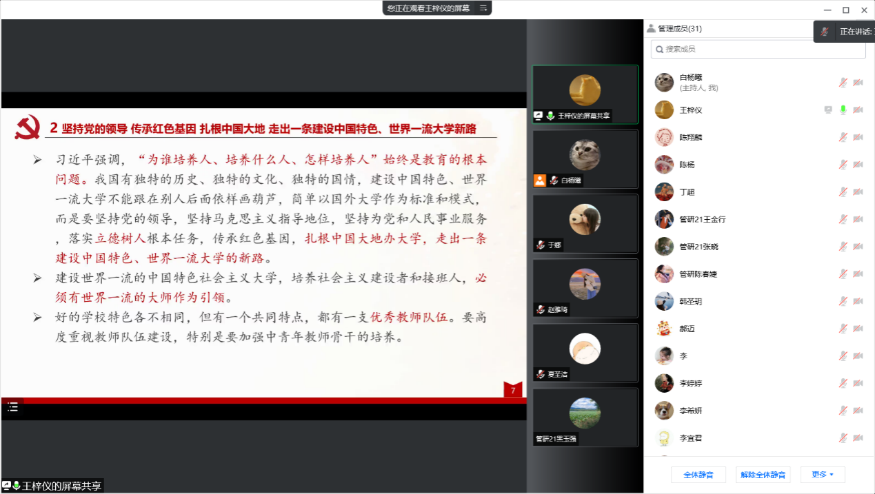 会后党员纷纷发表自己见解,21MEM白杨曦表示,通过学习习近平总书记在中国人民大学重要讲话精神,我明白了身为新一代青年人要坚定不移听党话、跟党走,努力成长为堪当民族复兴重任的时代新人,用脚步丈量祖国大地,用眼睛发现中国精神。总书记对学校如何讲授思政课提出了方向,思政课的本质是讲道理,要注重方式方法,把道理讲深、讲透、讲活,同时也是进一步为在校学生提出期待,要重视思政教育课。身为新时代青年党员,要将总书记的讲话精神落到实处,贯彻到实际生活中,不断为新时代发展做出自己的贡献。本次的讲话精神学习为我的学习与工作提供了坚实的理论方向,并激励我不断进行开拓创新。