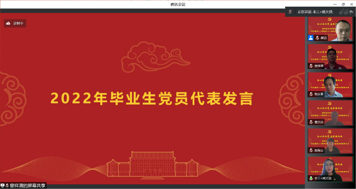 毕业生党员代表姚天琪和冯晓阳分别发表感言。感谢张庆春老师对毕业班党员的美好祝福和殷切期盼,感谢学院党组织对毕业生党员的关心,培养与教育。号召全体毕业生党员,无论是继续潜心学术,还是走上工作岗位,都要始终牢记党员身份,努力践行“实事求是,精益求精”校训精神,勤勉务实,认真工作,吃苦耐劳,为母校争光,为学院争光。