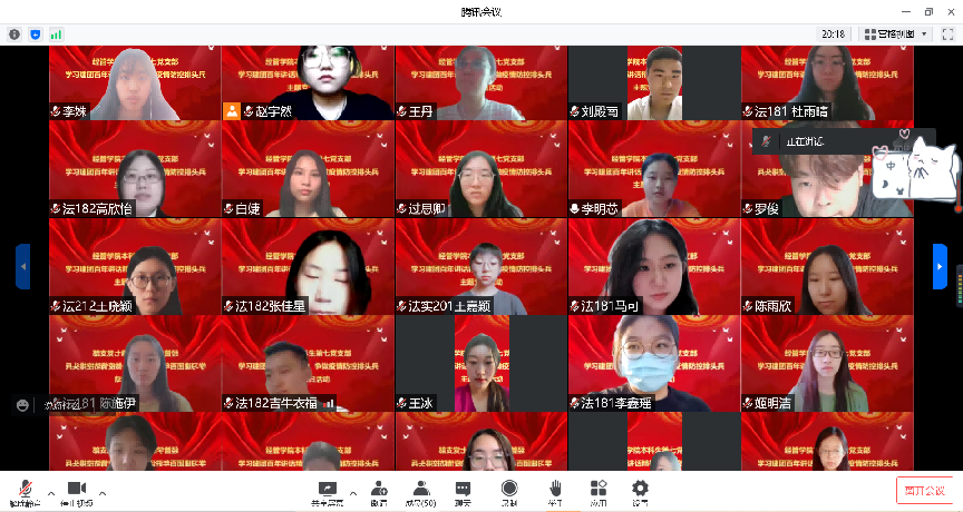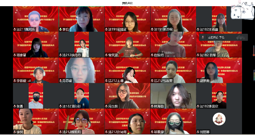 为深入学习贯彻习近平总书记5月10日在庆祝中国共产主义青年团成立100周年大会上的讲话精神,进一步发挥关键时刻党组织战斗堡垒和党员先锋模范作用,筑牢高校疫情防控坚实防线,2022年5月26日下午,百合漫画 本科生第七党支部组织全体党员和入党积极分子代表通过腾讯会议召开了本次“学习建团百年讲话精神、争做疫情防控排头兵”主题党日活动。会议由李明芯同志主持,百合漫画 副院长王丹老师参加活动并进行指导。