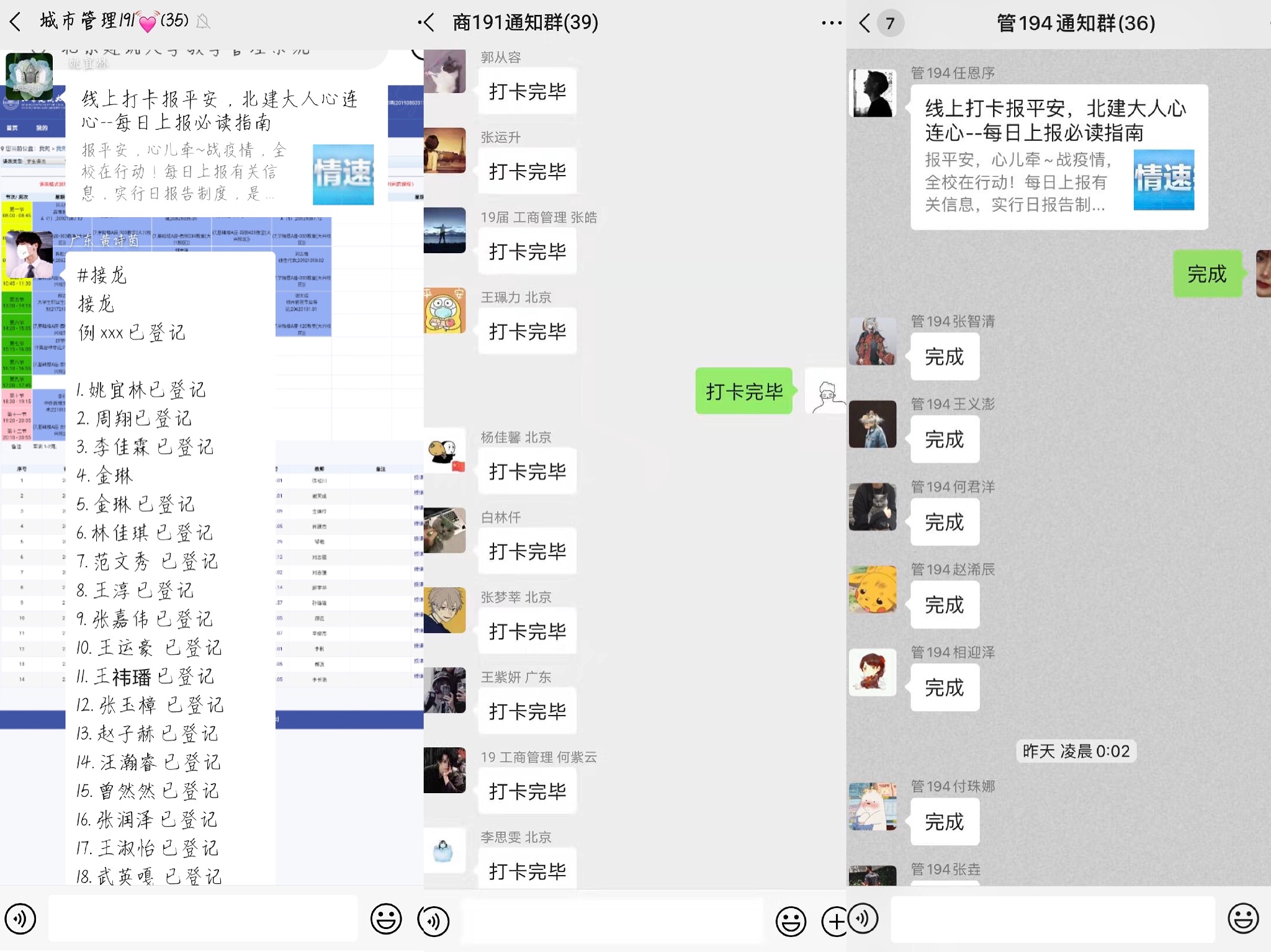 城191、管194等团支部开展每日打卡报平安活动,及时报告思想状况、健康情况和行动轨迹,方便学校及时准确地掌握学生健康状况第一手资料。