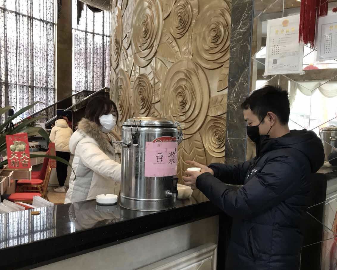叶少若给湖北籍滞留游客分发早餐(左一为叶少若)