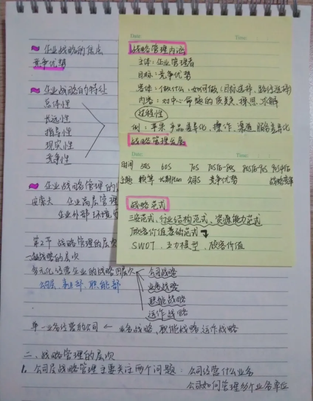 开学以来在家学习,我明显感觉这是对自制力的考验与锻炼。与在学校相比,在家学习减少了很多出行时间,可利用的时间变多了,但对自己的要求也会越来越严格。在这种特殊情况下,自律让自己不虚度时光。《战略管理》是这学期我比较喜欢的一门课程,我觉得工工整整的笔记可以使人愉悦,自己用心记下的各种重点,也使人在翻阅的时候感到满足感。内心os:自己用心记下的笔记真的能提升对所学课程的喜爱度。