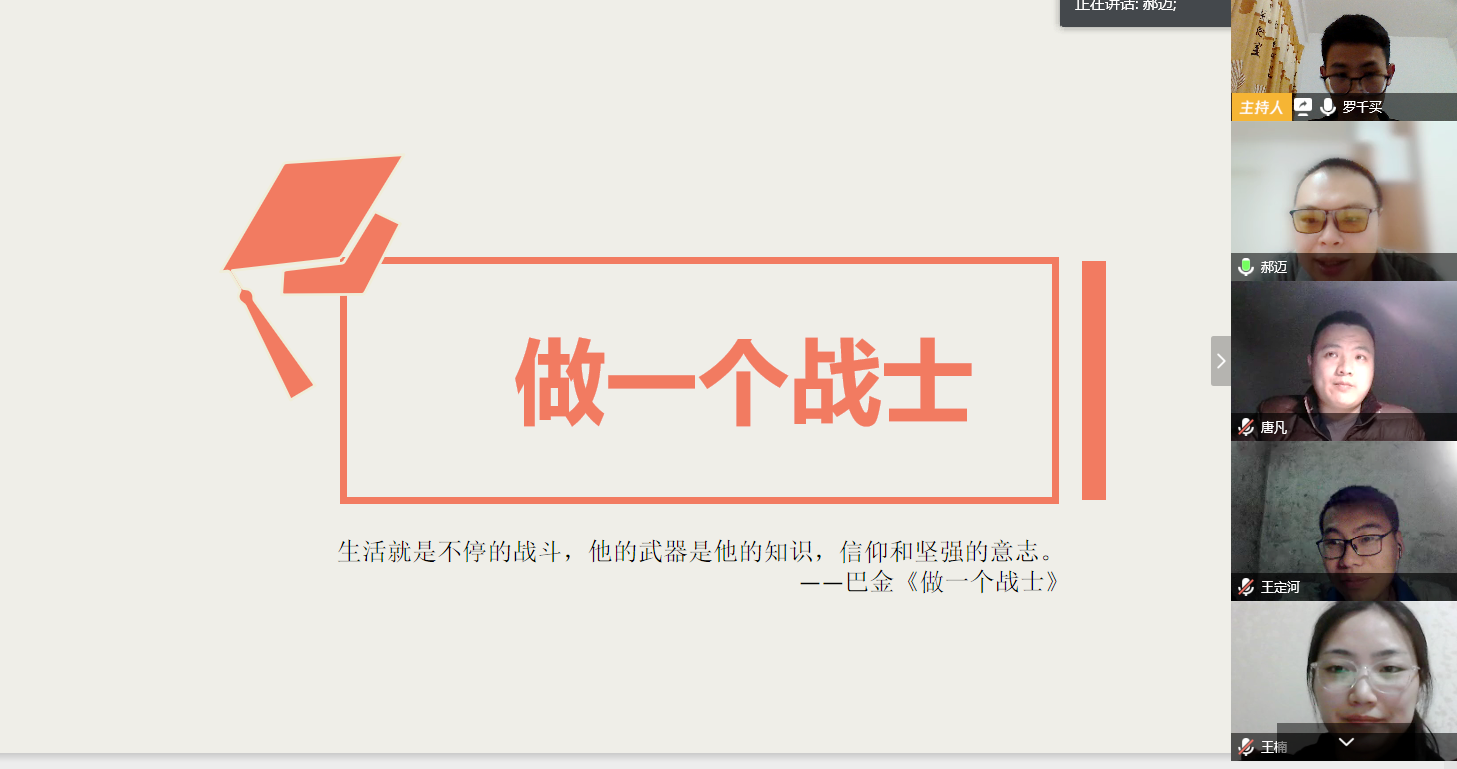 最后党支部书记郝迈同志对此次活动进行总结,他先对每一位同志的分享表示了肯定与感谢,呼吁大家要多读书、读好书,切莫荒废时间;然后向大家传达了学校对本学期研究生推选高级党课人员的安排;最后,老师就当前的疫情谈了一些想法:当前疫情防控工作到了最关键的阶段,要外防输入、内防反弹,要毫不放松的做好疫情防控工作。我们作为青年党员同志,要积极响应国家号召,不聚集不传谣,在自己的位置做好本职工作,全国人民团结一心,全力确保疫情防控阻击战的大胜必胜。