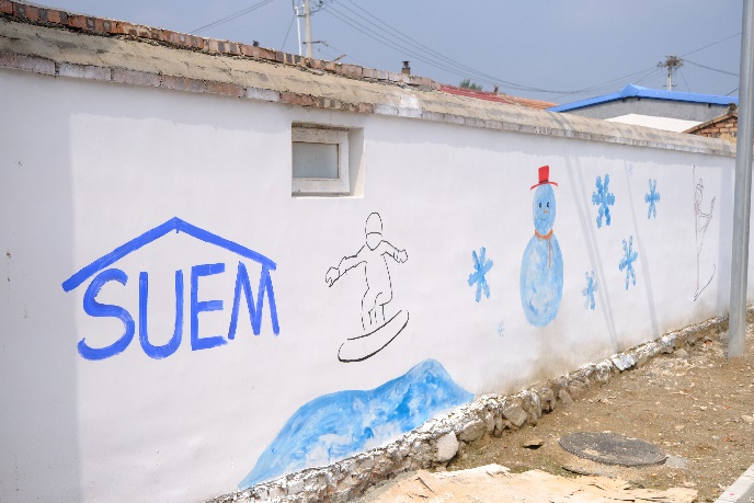 “冰雪延庆,激情冬奥”, 后黑龙庙村背靠2022年北京冬奥会延庆赛区所在地小海陀山。为了使村子更加贴合冬奥主题,本次实践中特意设置绘画组,帮助后黑龙庙村完成文化街道的冬奥壁画绘画的工作,营造冰雪冬奥、全民参与的良好乡村形象和氛围。同学们运用丙烯颜料在墙壁上绘画出冬奥会徽、冰雪项目插画以及迎合冬奥会的相关氛围感简笔画,营造出良好的文化氛围,也体现出北建大经管学子为后黑龙庙村冬奥建设贡献一份微薄之力。