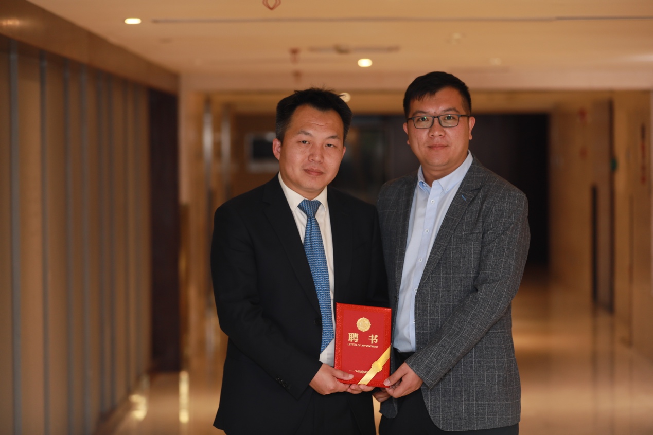 曹晓利主席(图左)向王胜辉颁发首批参与“校友平台”建设院校聘书