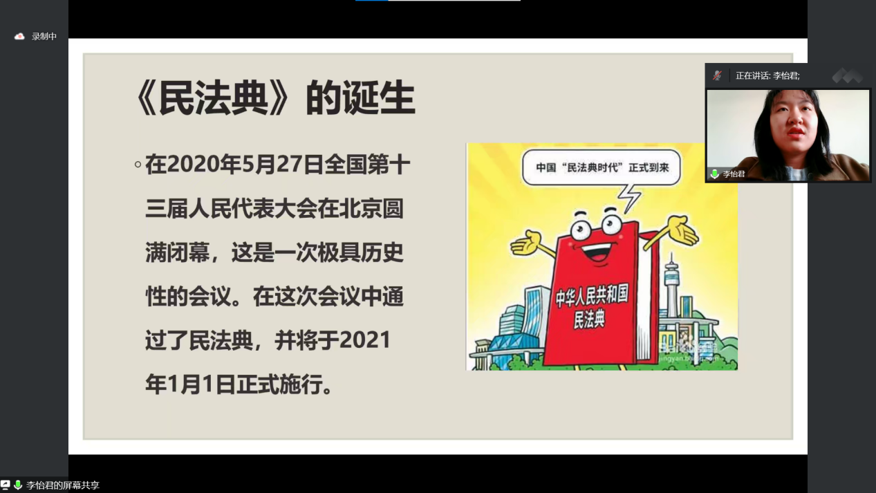 民法部分由李怡君同学进行讲解。本部分共分为三个模块,分别为《民法典》的意义和作用、民法的基本法律知识和案例研讨。通过这部分的讲解,让居民理解《民法典》编纂的原因和民法对调整法律关系的重要作用,加深法律在生活中的运用。