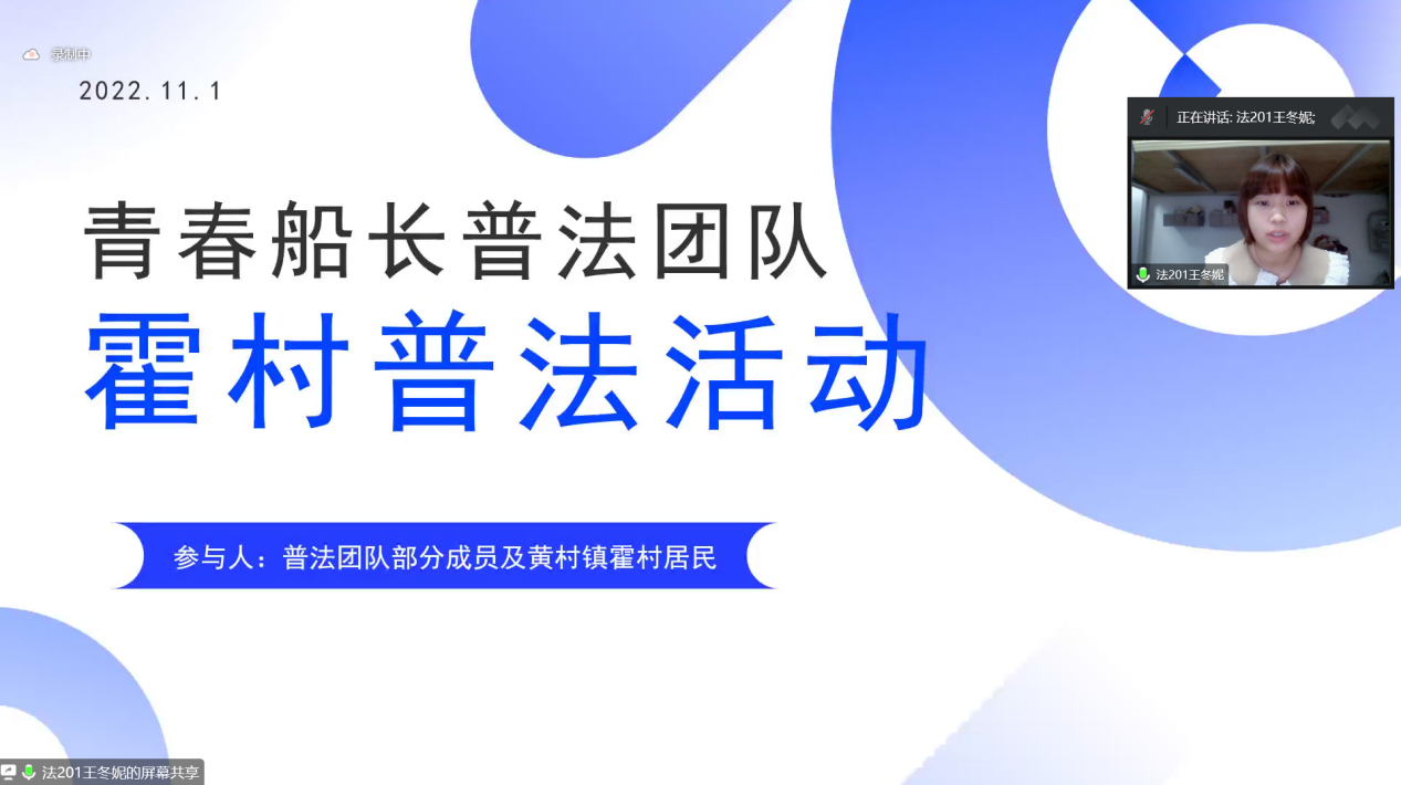为深入学习贯彻党的二十大精神,切实增强群众法治意识,11月1日青春船长普法团队与黄村镇霍村开展“法在你身边”法治教育主题活动。本次法治教育活动由青春船长普法团队王冬妮同学主持,青春船长普法团队14名骨干认真组织,黄村镇霍村共计30余名居民参与。此次主要以专题讲座和互动研讨的形式开展,内容涉及到民法、劳动与社会保障法以及安全保障法三个方面,以法律专业知识解读切入,结合生活中常见的案例分析,使居民充分认识相关法律条款规定承担的法律责任,教育居民养成遇事找法、处理问题靠法的思维习惯和行为模式。