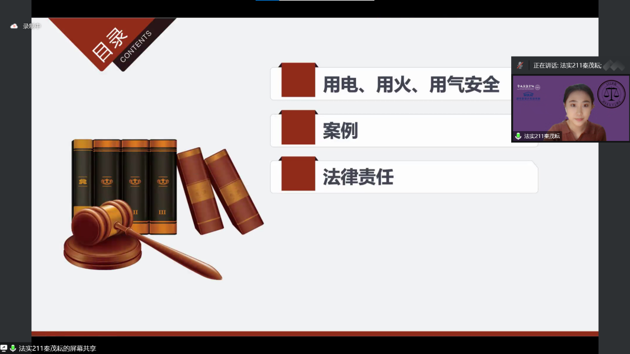 安全保障法由秦茂耘同学进行讲解。秋冬天气寒冷干燥,增加了线路的负荷,发生电气火灾的危险性增大,很多地方用气用火用电发生严重事故,本部分主要讲解用电、用火、用气安全以及违反相关法规应承担的法律责任。居民在日常生活中大多初步了解但防范意识较弱,通过本次讲解增强安全意识,提高防范能力,确保居民群众度过一个温暖、安全的冬天。