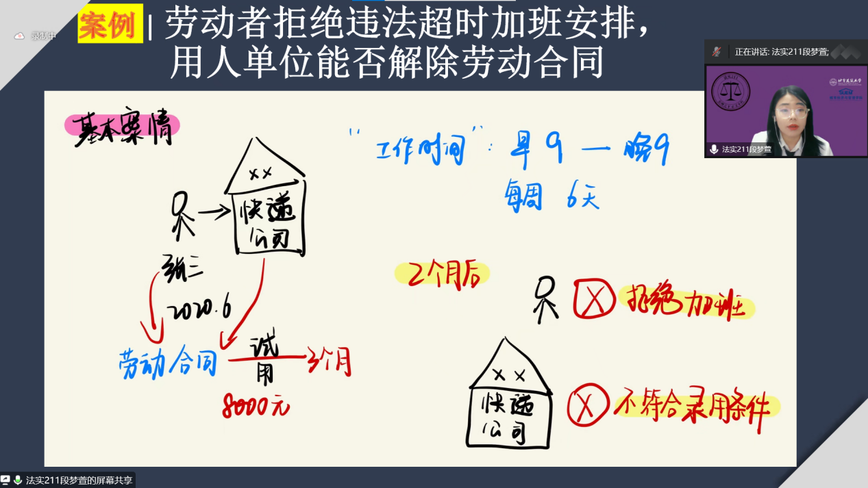 劳动法与社会保障法部分由段梦萱同学进行讲解。劳动法与居民们的生活工作最为密切,本部分由案例开场,引入劳动与社会保障法订立的意义与作用,劳动合同的区分、解除,劳动者权益保障途径、特殊工种的定义等,通过本次讲解可以有效解决居民们在生活中遇到的常见争议问题。