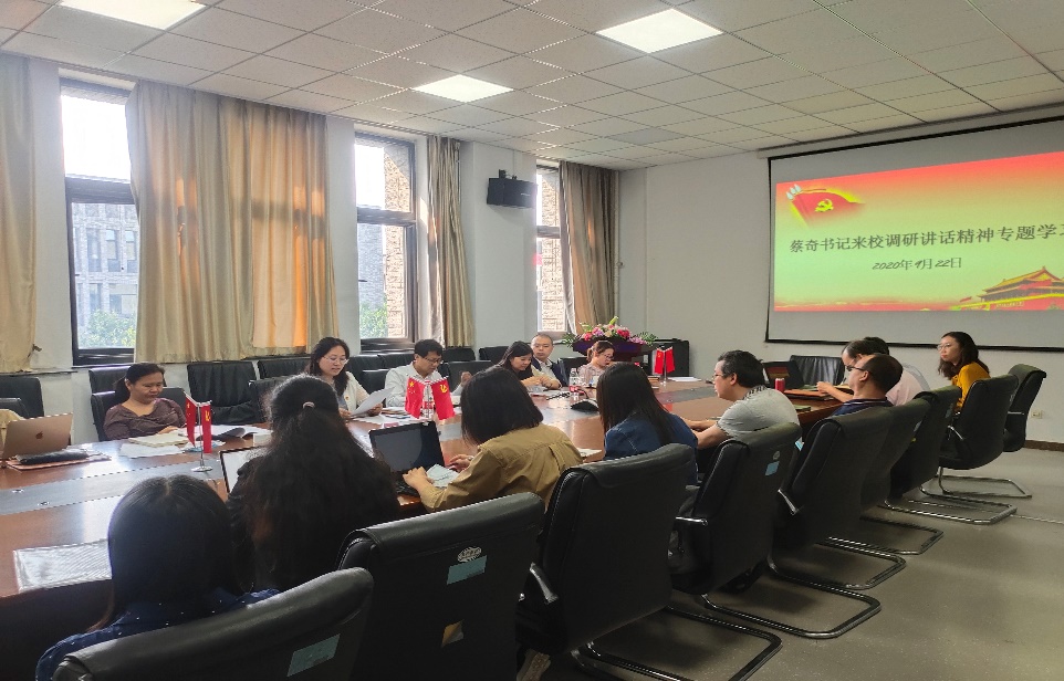 党委书记周霞首先传达了有关蔡奇书记到校调查研究的相关情况和指导讲话的相关内容精神、解读了学校党委关于贯彻落实讲话精神的相关部署、学习要求,结合学院实际,就下一步认真抓好学习和落实进行了重点部署。并强调,各支部书记、系主任和工会小组长,要高度重视本次学习活动,充分理解市委领导对学校的指示精神,整合各系校外共建单位资源,主动出击,寻找与讲话内容相契合的切入点,寻求学科、科研、专业、人才培养等中心工作发展的新机会,并充分为学院和学校的“十四五”规划贡献智慧和力量。