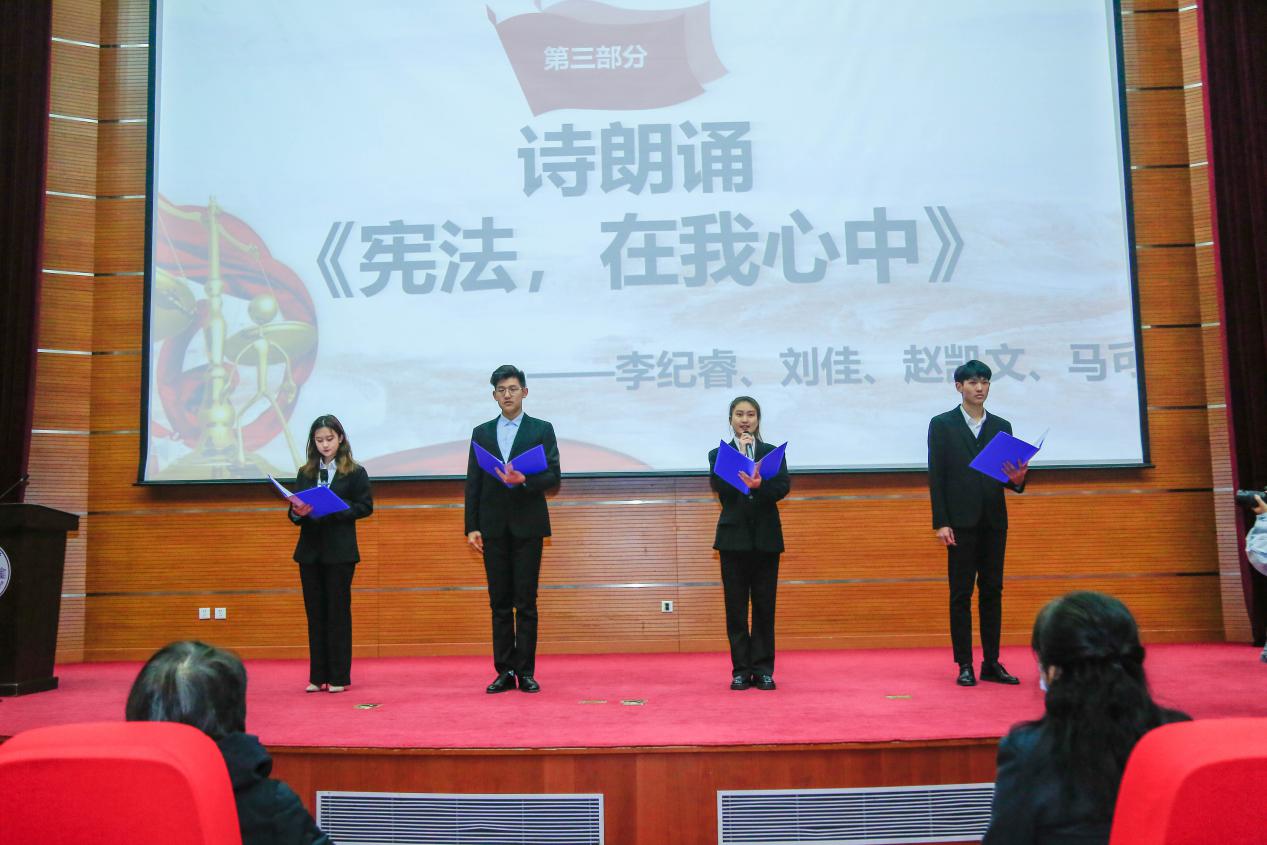 12月4日,在第七个国家宪法日来临之际,我校在基础楼A座报告厅开展“深入学习宣传习近平法治思想,大力弘扬宪法精神”“12·4”国家宪法日晨读活动。师生齐聚一堂,共同诵读宪法,集中宪法宣誓,用宪法宣誓的仪式感塑造宪法信仰,进一步营造庄严浓厚的尊崇宪法、学习宪法氛围。党委常委、文化发展研究院院长孙冬梅,党校常务副校长程士珍,百合漫画 院长孙成双以及百合漫画 、测绘学院、理学院师生代表共计三百余人参加此次活动。活动由百合漫画 党委书记周霞主持。