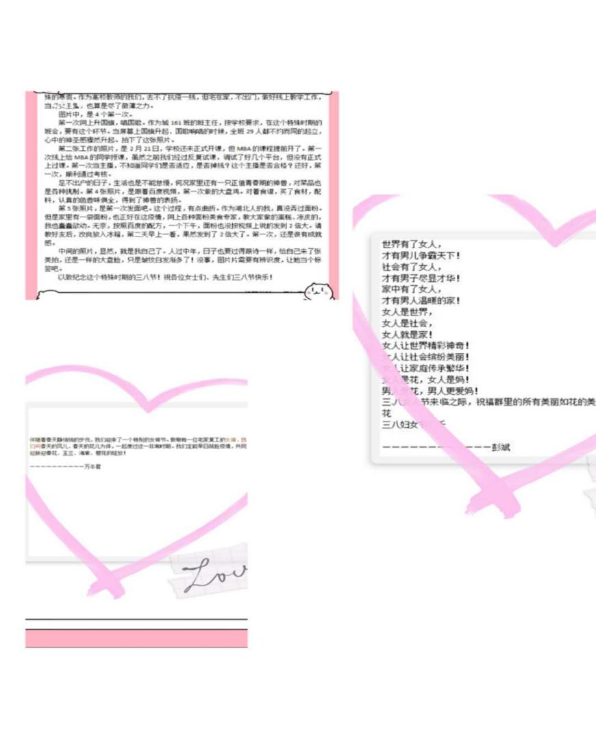 活动得到了广大女教职工的积极响应和热情参与上传了最美照片。一张张照片记录了女教职工们疫情期冲锋在前、主动担当之美;记录了教学一线“镜头里的女主播”热爱教育、知性之美;记录了生活中“热爱生活、温暖家庭”的生命之美。