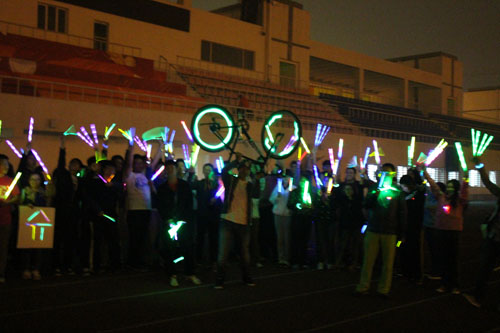 10月9日晚上8时许,数百名同学已经聚集在操场领取荧光装备,原本寂寥的场地,马上变成了荧光悦动的舞场。五颜六色的荧光棒、荧光胸牌,荧光泡沫管,荧光贴纸交相辉映,前来参与夜跑的学生成为了夜晚校园的主角。