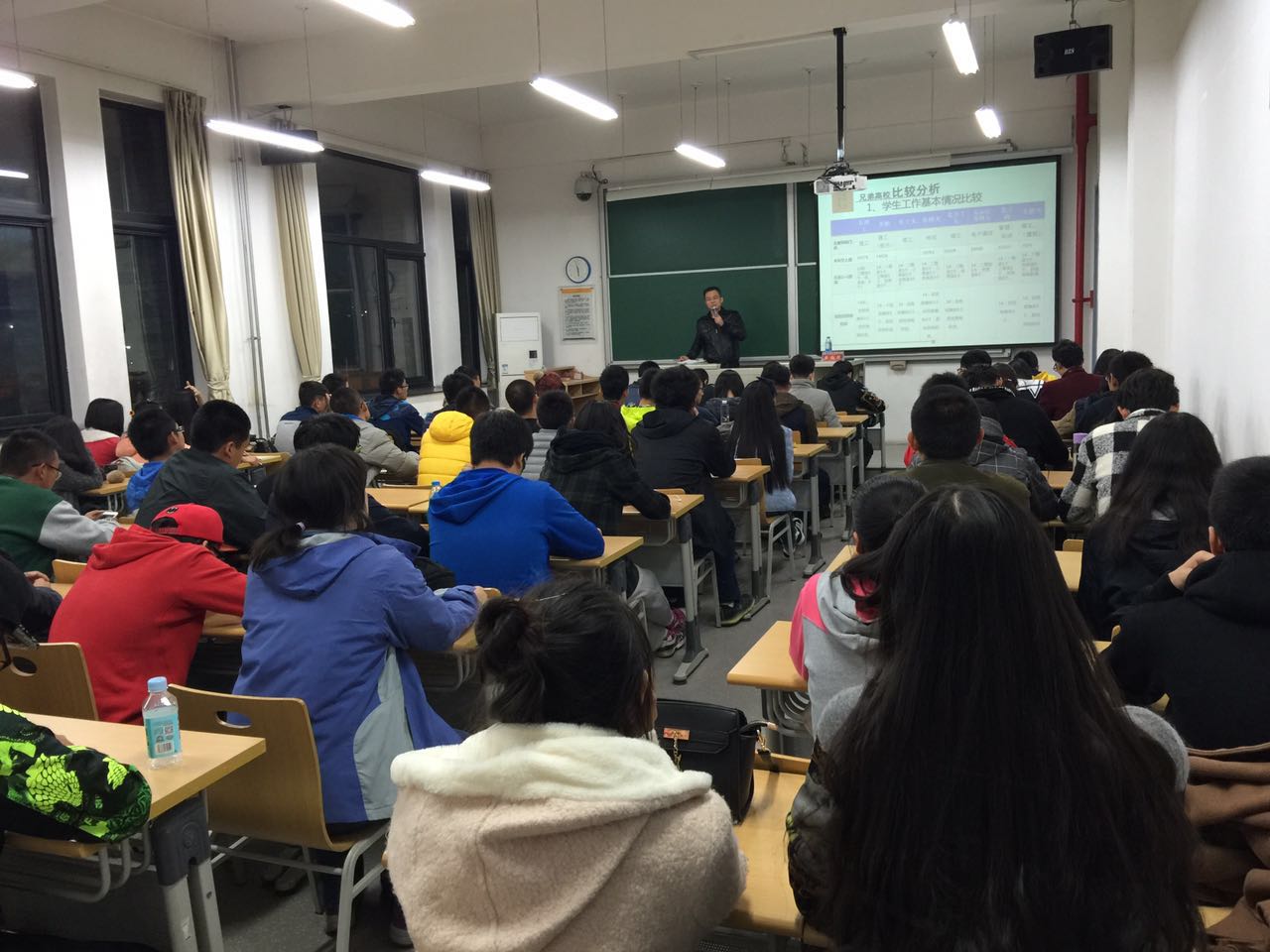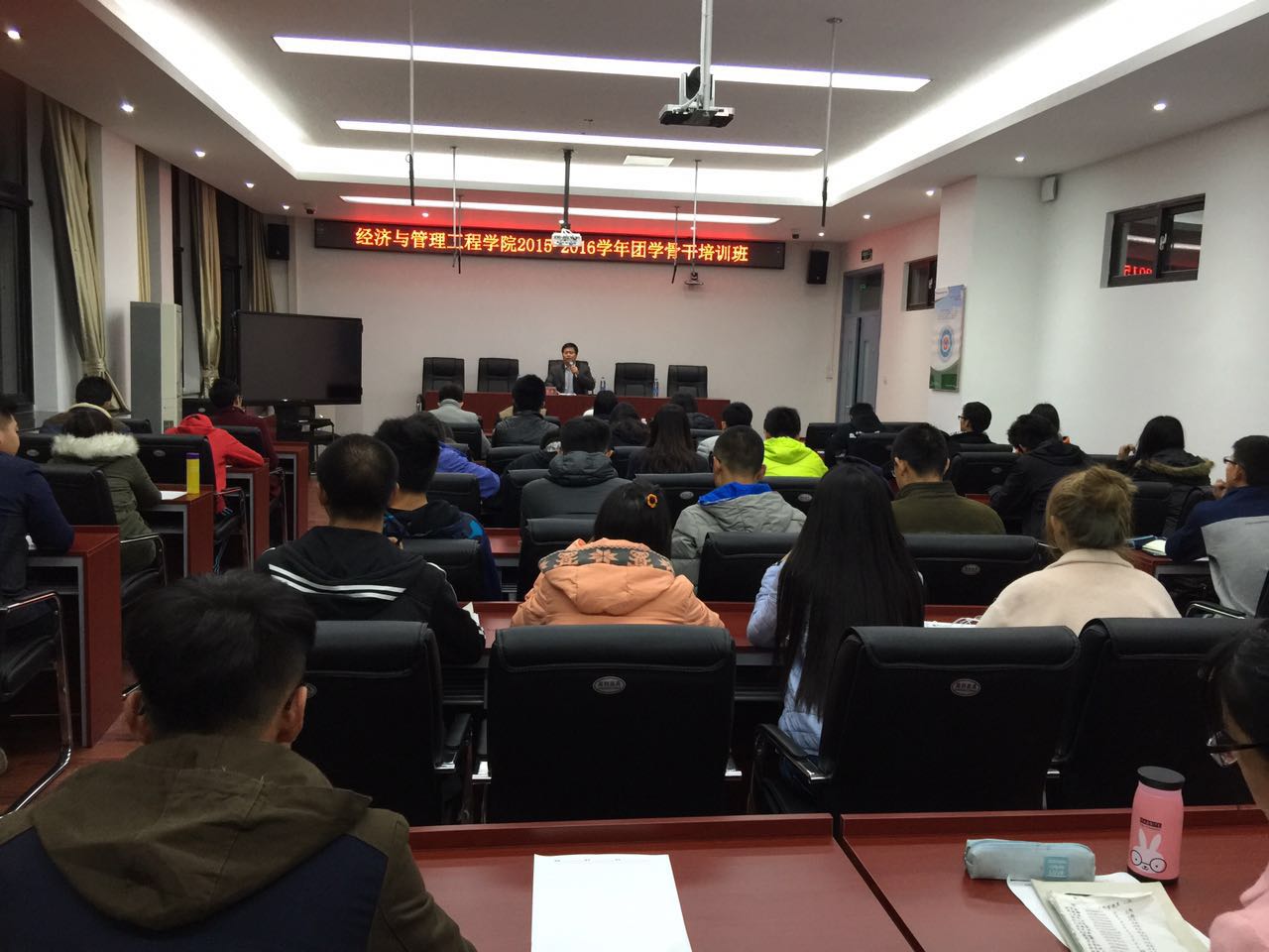 分团委2015-2016学年团学骨干班理论讲座培训环节于11月3日下午先后在大兴校区学院楼A座115教室和413教室举行。特邀请校学工部部长黄尚荣、马克思主义学院张守连做讲座,学院分团委书记曹晓云、2015级辅导员李文超、全体2015级班委和学生会骨干参加培训学习活动。培训会由分团委书记曹晓云主持。
