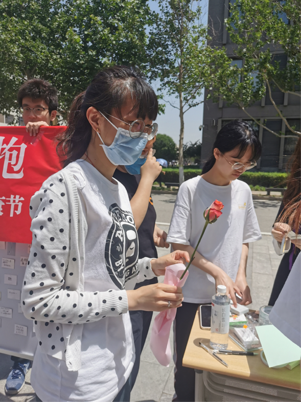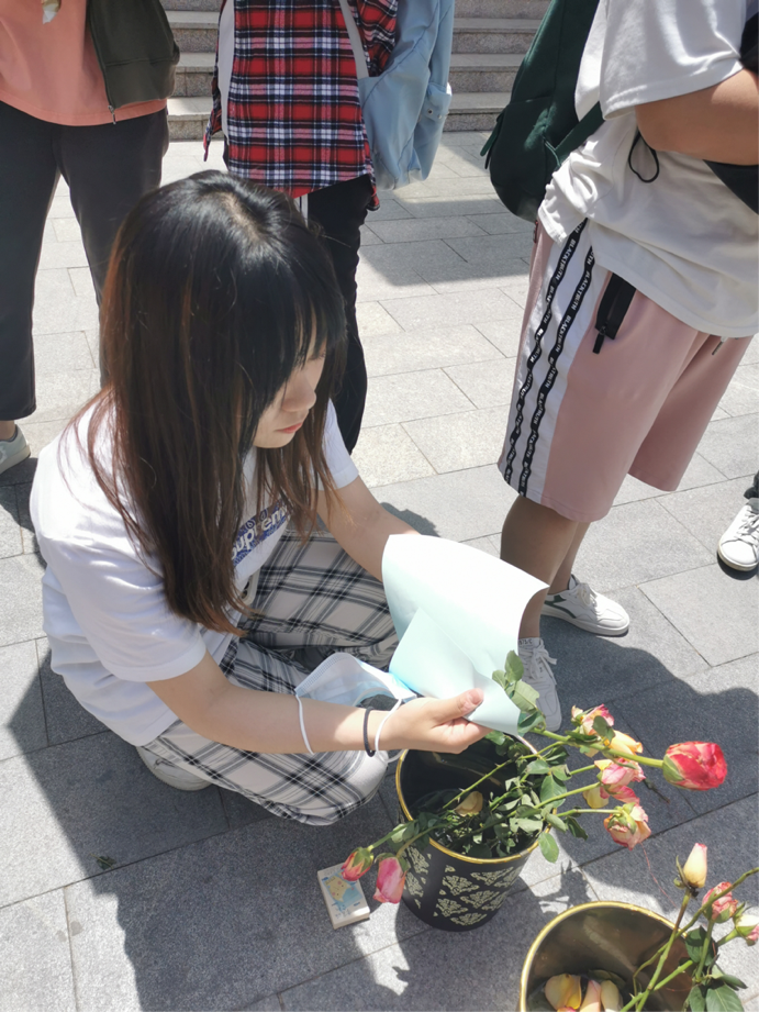 为了防止同学们被玫瑰花刺扎到,我们的工作人员贴心的在花茎上包上了彩纸。