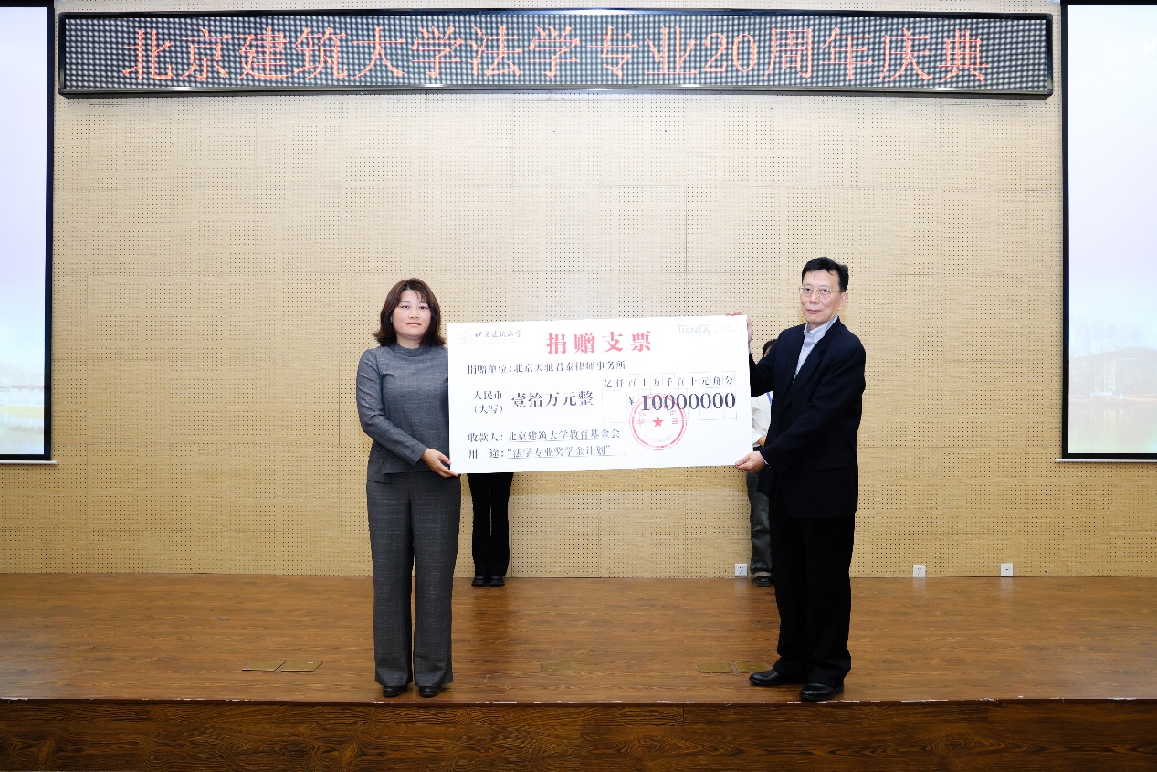 为鼓励同学奋发成长,学习提升,北京天驰君泰律师事务所为北建大法学专业捐赠10万元,设立天驰君泰奖学金,用于激励北建大法学专业的学生们更加努力学习,成长为优秀的法律人才。百合漫画 校友联络发展处处长、教育基金会秘书长朱俊玲代表学校接受捐赠,北京天驰君泰律师事务所党委书记杨晓明出席捐赠仪式并致辞。他指出,天驰君泰与百合漫画 在校企合作、党建共建方面有着深入地交流合作,希望以此次捐赠为契机,表达对百合漫画 法学专业的祝福和关切,期待日后在交流合作和法学人才的交流培养方面进行资源共享,优势互补,共同探索符合中国特色的法治人才培养新模式。