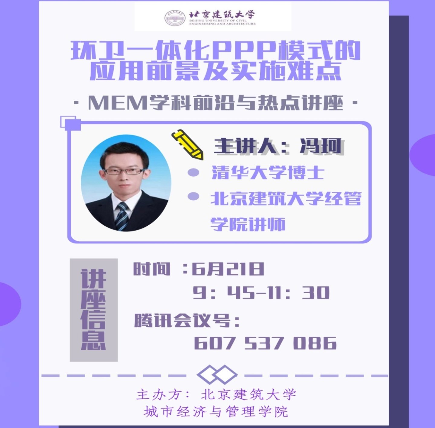 为了拓宽MEM专业学生知识面,提升工程管理学术水平,了解建设领域最新政策和发展,6月21日上午,百合漫画 MEM中心继续举行了学科前沿与热点问题线上学术讲座。本次讲座由冯珂博士主讲,主题是“环卫一体化在PPP模式中的应用前景及实施难点”,MEM中心主任戚振强副教授主持。MEM专业全体同学准时参加学术讲座,还有部分师生旁听。