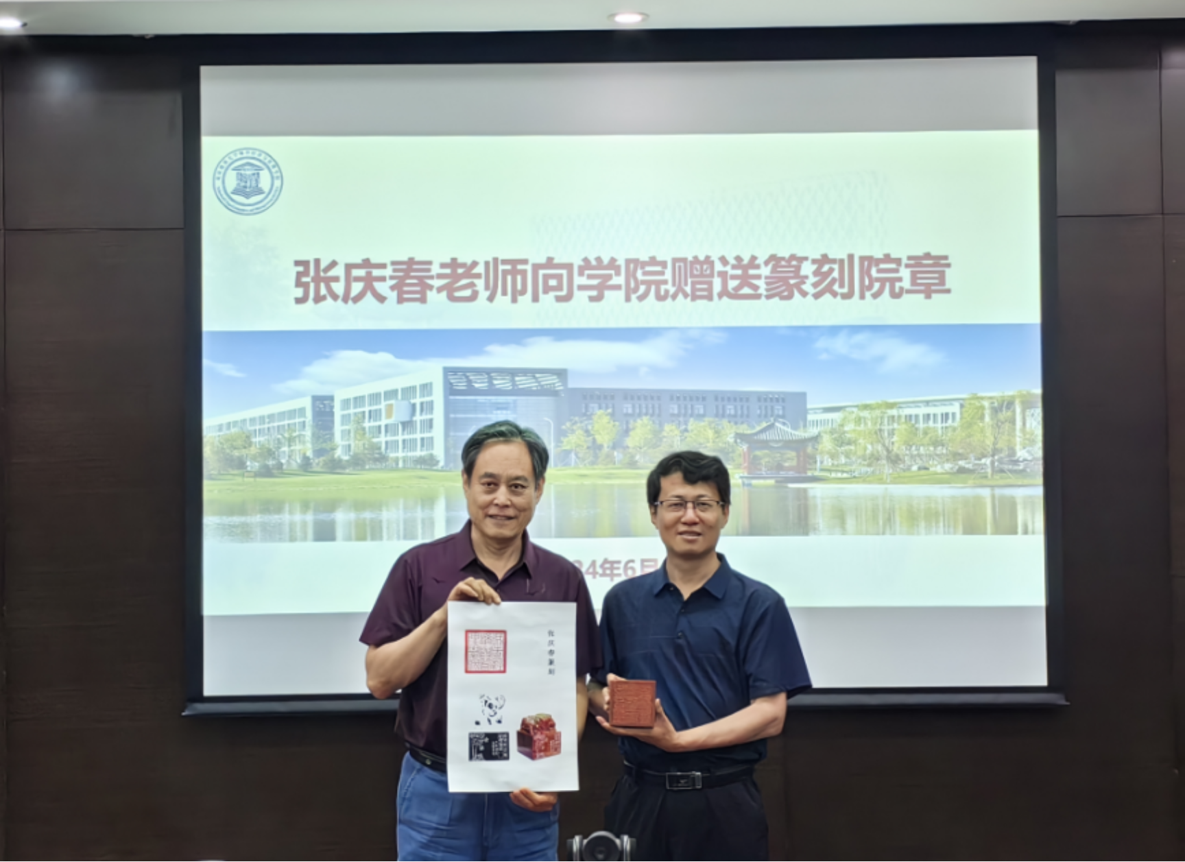 会上,退休党支部书记张庆春向学院赠送了亲自设计篆刻的“百合漫画 ”印章。