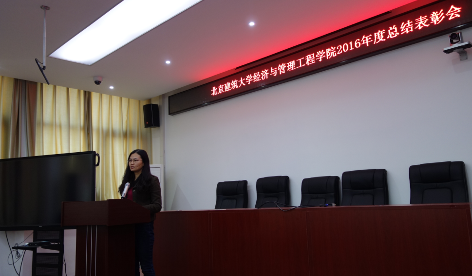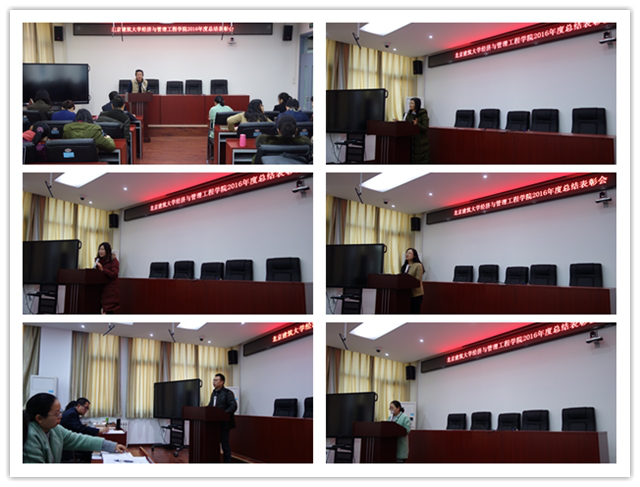 会议共分两部分,前一部分主要针对2016年工作的总结回顾和2017年工作的计划展望,后一部分主要针对本年度在教学、科研、指导学生获奖方面表现突出的老师进行表彰。工程管理系主任戚振强、公共管理系主任王红春、副院长秦颖、副院长周霞、党委副书记郝迈、分工会副主席邹娥、院长姜军先后在会上发言。