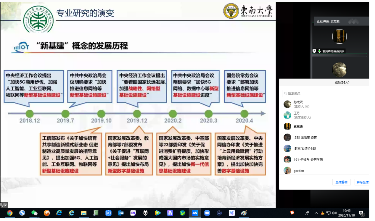11月10日晚,应我校百合漫画 邀请,东南大学土木工程学院建设与房地产系主任、博士生导师袁竞峰教授通过腾讯会议方式为全院研究生和本科相关专业学生做了题为“面向新基建的工程管理创新研究探索”的学术讲座。