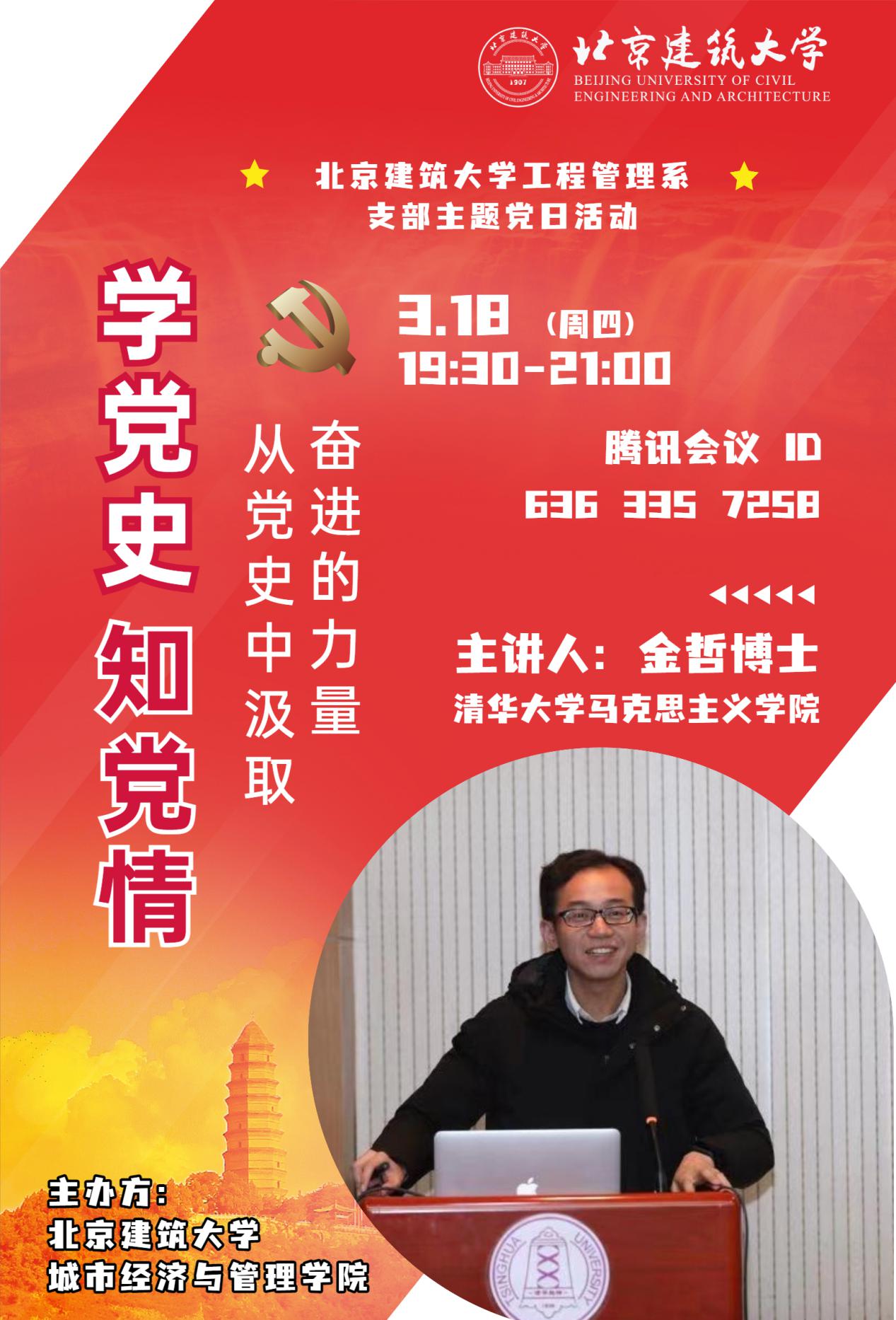 3月18日,工程管理系开展“学党史、知党情,从党史中汲取奋进的力量”主题党日活动。本次主题党日活动要求清华大学马克思主义学院金哲博士做专题报告。