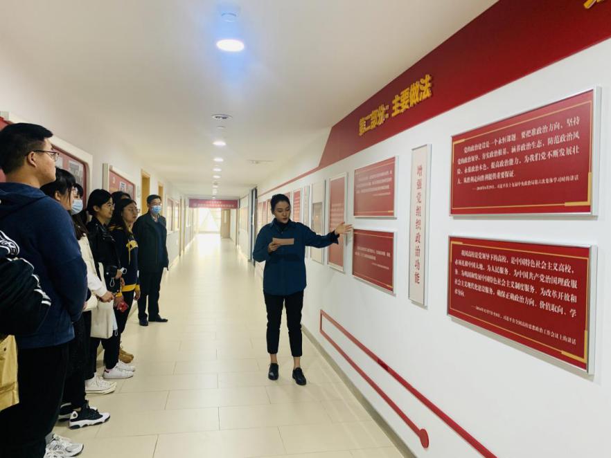 参观伊始,基地讲解员向支部支委详细介绍和讲解学校基层党组织政治实训基地的创办过程以及实训基地的具体内容。