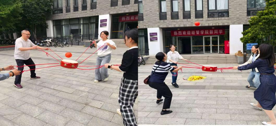“同心鼓”项目奏响团结乐章。教职工们环绕鼓身各执一绳,合力控制鼓面颠球,需精准把控力度与节奏才能让排球持续跳跃。从最初的节奏混乱到逐渐默契配合,大家在一次次尝试中加深协作,鼓面与排球的碰撞声伴着喝彩声此起彼伏。
