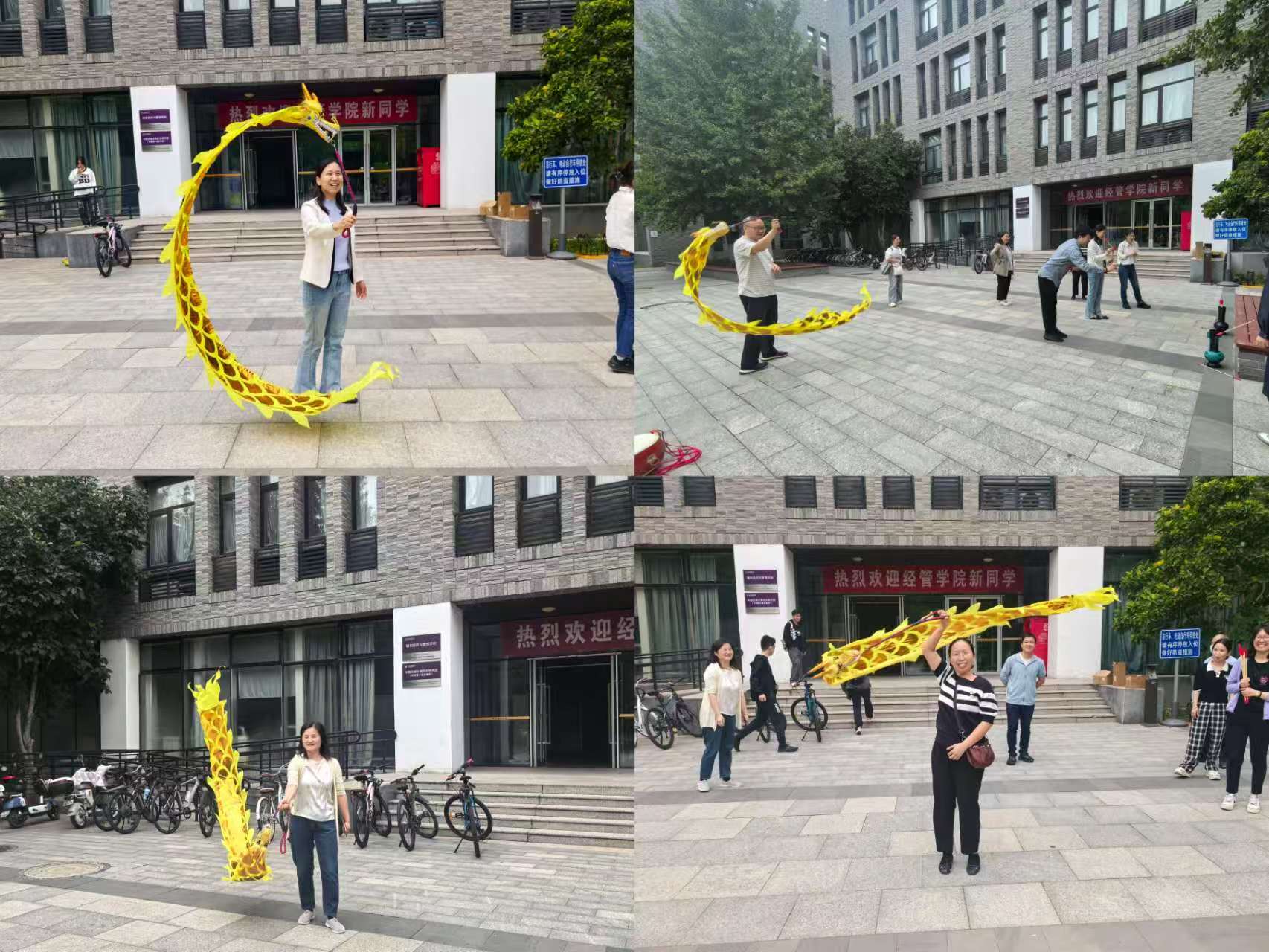 “舞彩龙”区域人气最旺,熟料龙头搭配双面烫金彩带的道具格外亮眼,教职工们争相尝试。龙头在空中翻飞,既考验力量与技巧,更展现出教师们的活力风采,各式灵动花形轮番呈现。
