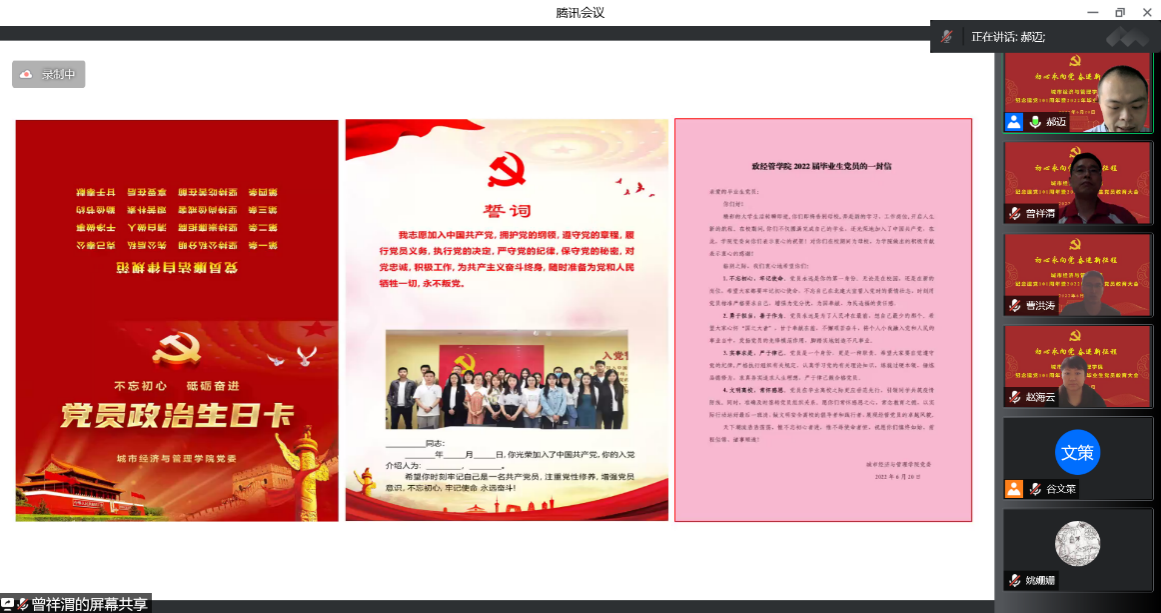 结合毕业生党员离校教育契机,学院党委组织了“初心永向党,奋进新征程”庆祝建党101周年暨毕业生党员教育大会,精心策划了“一堂老党员微党课,一张党员政治生日卡,一封毕业生党员慰问信,一次重温入党誓词”等环节,教育引导全体毕业生党员赓续红色血脉,弘扬伟大建党精神,激发毕业生党员的爱国爱党爱校情怀,心怀“国之大者”,争做“国之大才”,满怀信心奔赴祖国各地建功立业。大会邀请了学院退休教师党支部党员共同参与,并由学院关工委副主任张庆春老师为同学们讲授“再书栋梁新篇章” 微党课,引导同学们在建党101周年之际,站高望远,铢积寸累,奋力登攀,勇于亮出自己的共产党员身份,正心明道,行稳致远,建善筑实。