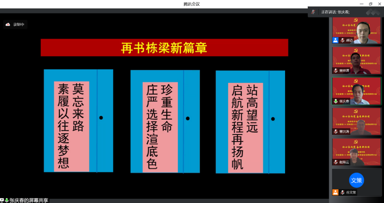 张庆春以“再书栋梁新篇章”为主题为党员们讲授微党课,从“素履以往逐梦想,莫忘来路”“庄严选择渲底色,珍重生命”“启航新程再扬帆,站高望远”三个方面展开,提醒广大党员,大学四年的勤学苦练吸取了足够营养,从入学时的“素人”完成了向“人才”“职业人”和“接班人”的转变,在毕业之际,思想上要做好为社会服务、为人民服务和为党服务的准备。毕业之后,要聚焦定位,牢记入党誓言,珍惜政治生命,做到与祖国的需要同向同行,与党和人民的需要同频共振。并鼓励同学们在百年未有之大变局和建党101周年之际,站高望远,铢积寸累,奋力登攀,勇于亮出自己的共产党员身份,正心明道行稳致远,建善筑实。