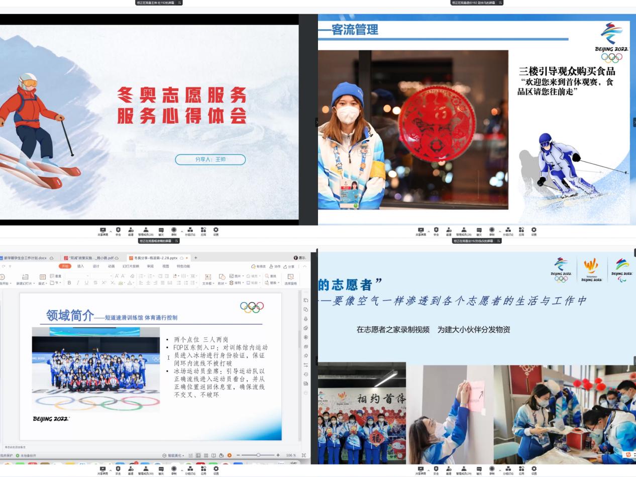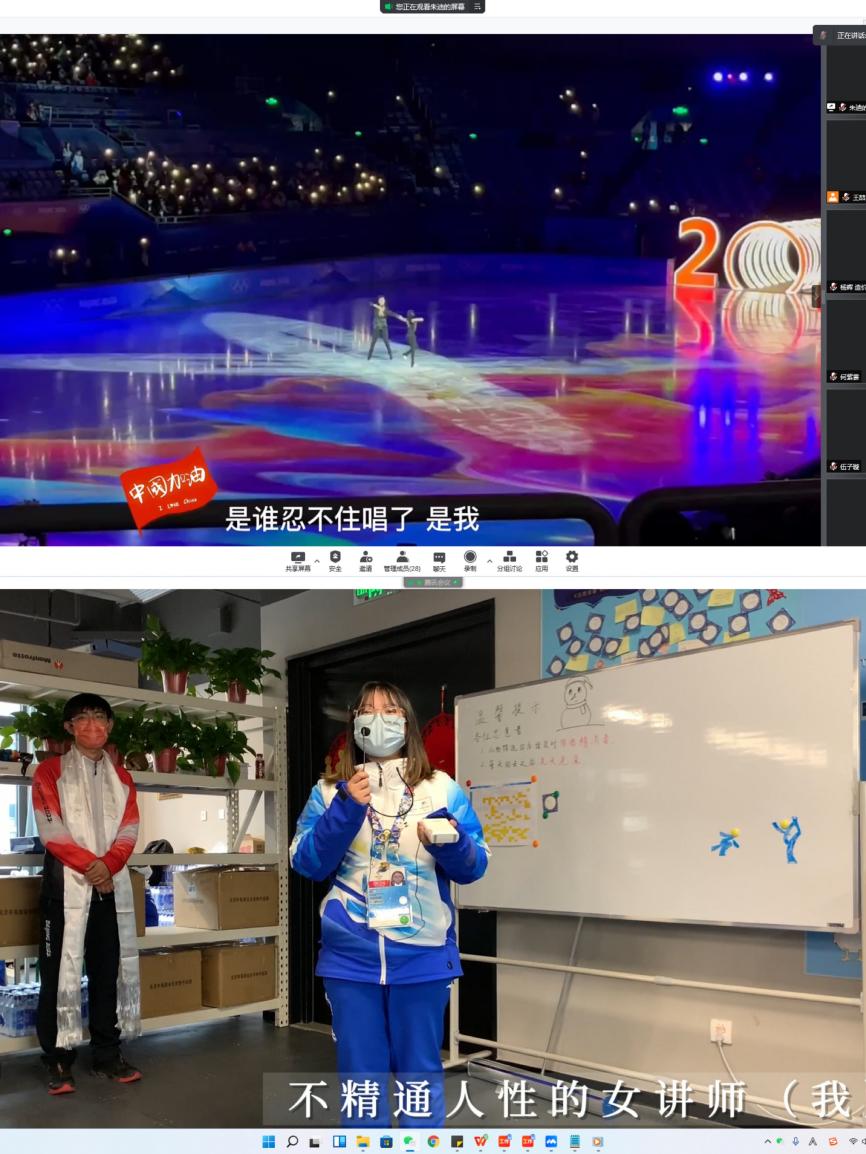 会上,交通领域志愿者伍子璇向大家展示了闭环内志愿者驻地环境,介绍了隔离安排。场馆通行控制志愿者王帅、赛事服务志愿者赵宇凡、体育通行控制(短道)志愿者杨凌萌、志愿者领域经理助理孙泓仪分别分享自己在冬奥志愿服务中的心得体会。场馆通行控制志愿者朱迪、赛事服务志愿者杨辉展示了自己制作的vlog。孙泓仪还向大家介绍了百合漫画 志愿者冬奥会原创歌曲《微光筑梦》。