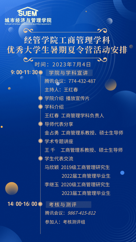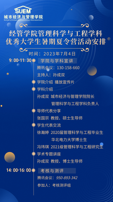 管理科学与工程学科夏令营活动由学院院长、学科负责人孙成双教授主持,孙成双教授对学院和本学科的建设与发展做了详细的介绍,同时围绕学术前沿问题进行了学术专题讲座,张国宗教授作为导师代表分享了指导学生开展课题研究的经历,两名研究生代表与营员交流了考研、读博、就业的相关经验。
