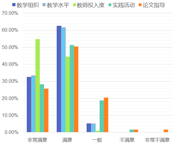 从问卷情况看,学生对学院的教学活动、师德师风 是满意的。其中,“教师投入度”、“教学水平”和“课堂教学组织”达到“满意”和“非常满意”的比例在90%以上。