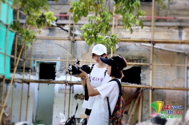图为实践团摄制组成员拍摄正在修缮中的“乐群楼”。摄制组用镜头记录了数量众多的未改造、改造中和改造完毕的古厝洋房,为后续的工作积累丰富的资料。中国青年网通讯员 蒙达 摄