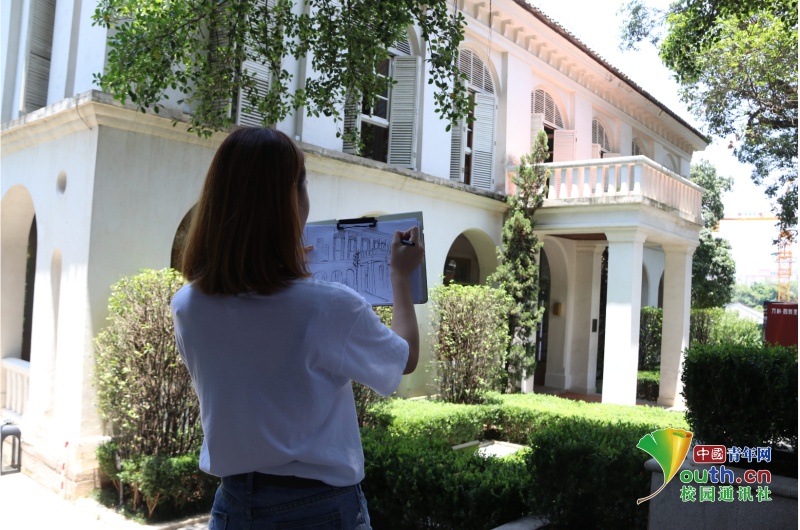 图为实践团成员手绘爱国路2号(美国领事馆)。实践团不仅用脚步丈量福州,更是通过手绘福州的经典古厝,让凝固的建筑变成纸上跃动的艺术品,这是擦亮福州古厝金名片的重要环节。中国青年网通讯员 陆泽楠 摄