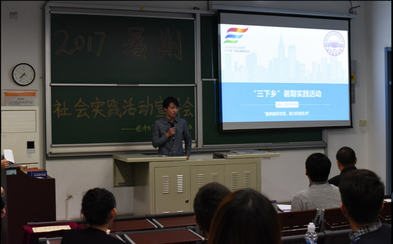 最后进行宣讲的是“三下乡”组,来自城161班的商云帆学长进行汇报。为响应在2017年暑假共青团委开展的“三下乡”暑期社会实践活动,该团队通过实地走访调研河南省安阳市内黄县,了解当地产业规划发展的成果和存在的问题,通过团队成员所学相关专业知识给出相关建议。秉承着“服务脱贫攻坚,助力科技支农”的原则,团队前后共三次从郑州前往内黄县,分别走访调研了内黄县陶瓷产业园区,内黄县城乡规划管理局,内黄县产业聚集园区。经过调研之后,团队总结到前期规划的重要性、经济发展与环境问题的冲突、产业发展集聚化链条化的影响、地方执行政策的割据性是应该注意思考的问题。