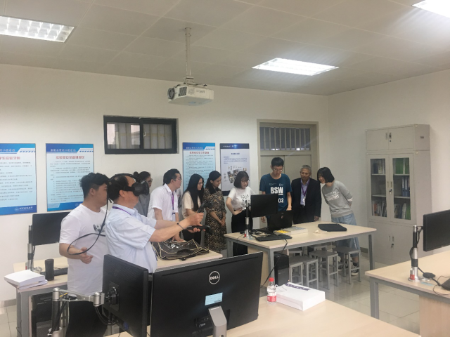 随后,戚振强老师带领专家们来到BIM实验室考查学生BIM方向的毕业设计成果,同学们将渲染后的3D设计成果展示给专家,并让刘卡丁教授感受了作品的VR效果,身临其境体验了同学们的设计成果,并得到了专家们的一致认可。