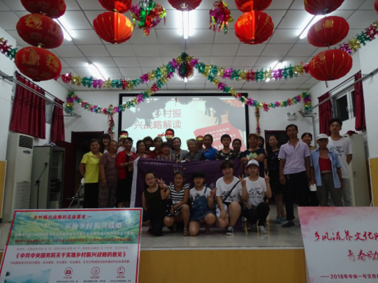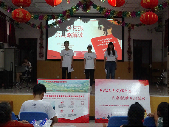 实践团以“厉害了我的国”、“乡村振兴战略大家谈”两个话题为切入点,用视频、PPT等形式详细介绍历年来“三农”政策变革、乡村振兴战略等内容,指出党的十九大报告“产业兴旺、生态宜居、乡风文明、治理有效、生活富裕的总要求”,并强调乡村振兴是由政府主导、村民配合合力推进的,村民是乡村振兴的主角,是乡村振兴的受益者。同时, 实践团着重介绍“乡风滋养文化兴盛,青春助力乡村振兴”主题实践活动的具体内容,详细阐述乡村文化振兴的重要意义,用接地气的语言,生动形象的案例,丰富精彩的内容,结合营城村实际情况,讲到村民心坎上,解开村民思想上的疙瘩,让村民听得懂、能领会。