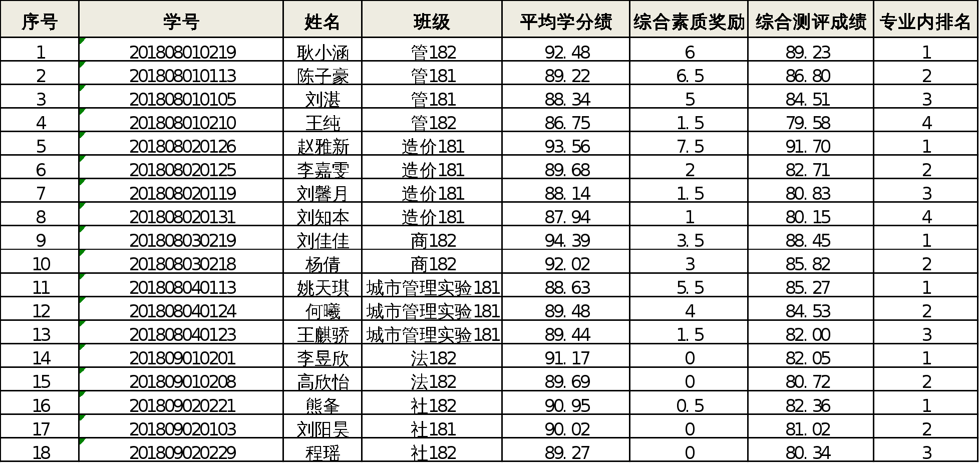 本次共有18名符合推免条件的同学申请推免,综合测评成绩和专业内排名如下表所示: