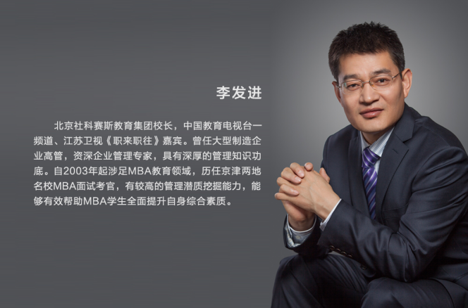 嘉宾简介:现任北京社科赛斯教育集团校长,中国教育电视台一频道、江苏卫视《职来职往》嘉宾。曾任大型制造企业高管,资深企业管理专家,具有深厚的管理知识功底。自2003年起涉足MBA教育领域,历任京津两地名校MBA面试考官,有较高的管理潜质挖掘能力,能够有效帮助MBA学生全面提升自身综合素质。